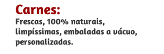 Referencia em carnes frescas, nunca foram congeladas; sem injeção de água, química ou conservantes, limpissimas no ponto de usar sem percas, cortes bem elaborados e inovadores.